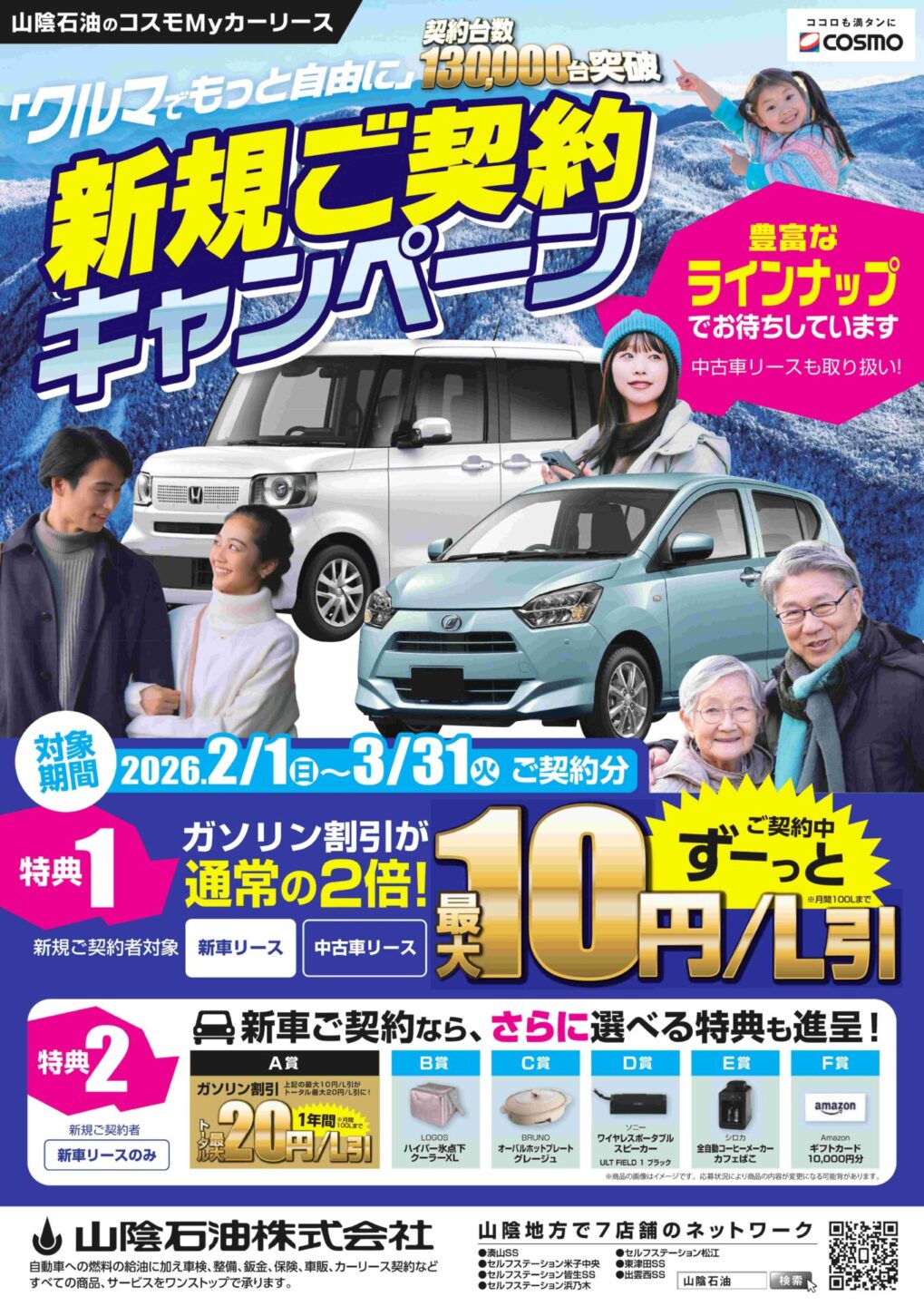 山陰石油では「コスモMyカーリース」の新規ご契約キャンペーンを実施中です!